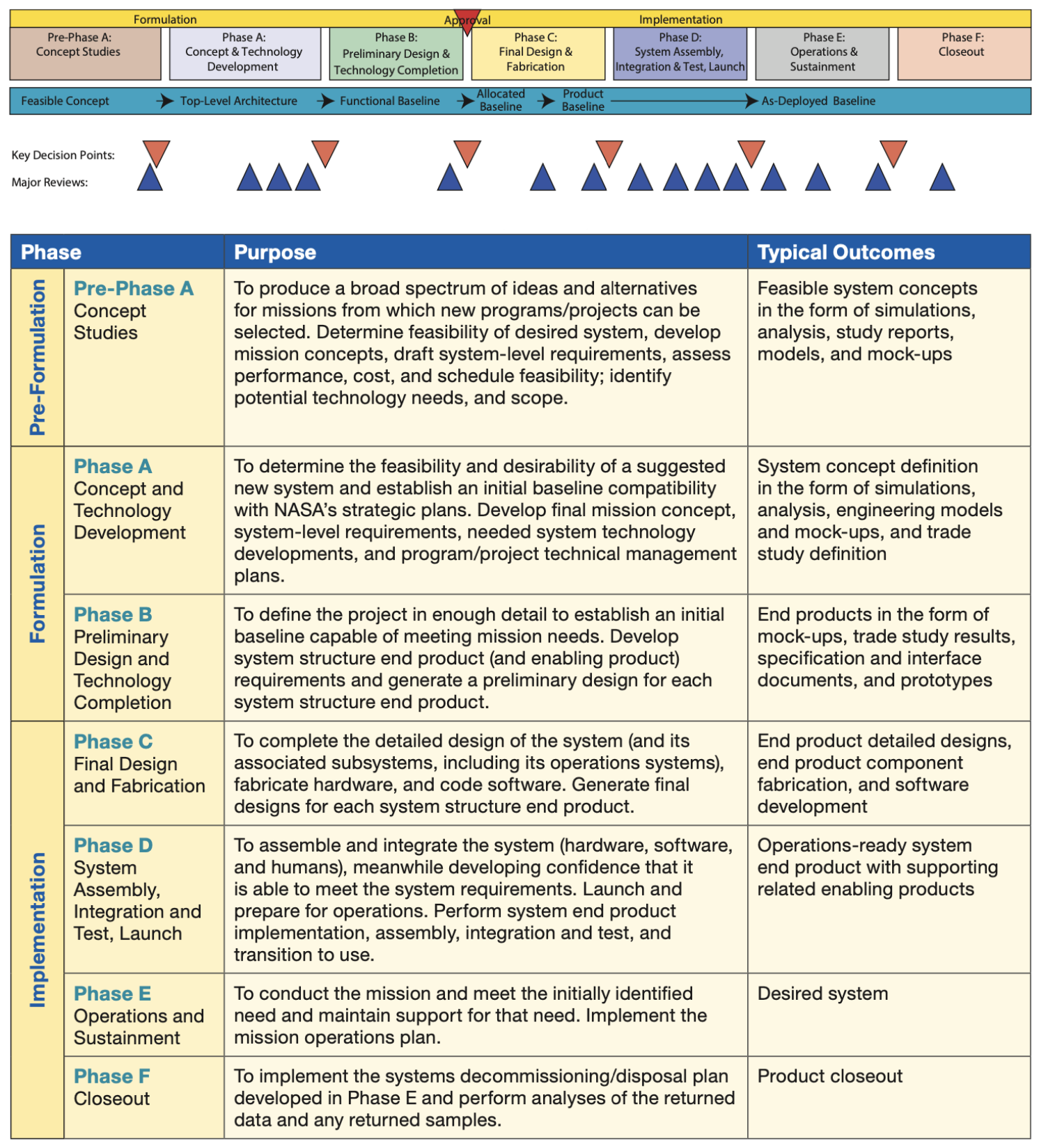Those interested in a more detailed breakdown of these phases, all the key decision points, typical activities in each phase, and their expected outputs, should see section 3.0 of the nasa Systems Engineering Handbook, and its expanded guidance companion.